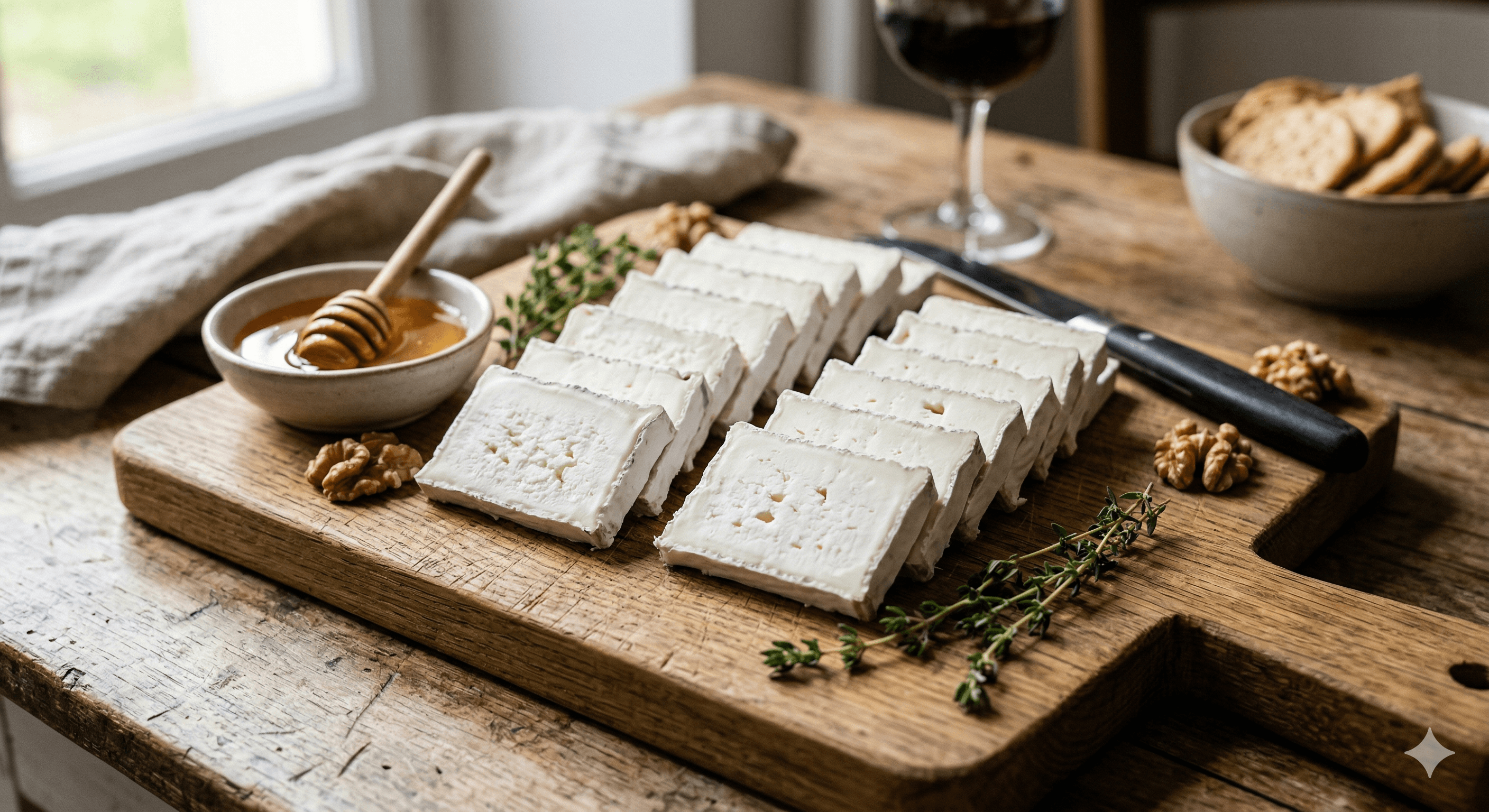 Pour cette création, nous ne voulions pas d'un fromage trop discret. Nous avons choisi un fromage de chèvre affiné. Avec le temps, le chèvre gagne en intensité et développe des arômes plus marqués. Une fois déposé sur notre base de crème fraîche, il fond tout en gardant sa personnalité. C'est lui qui donne le ton dès la première bouchée.